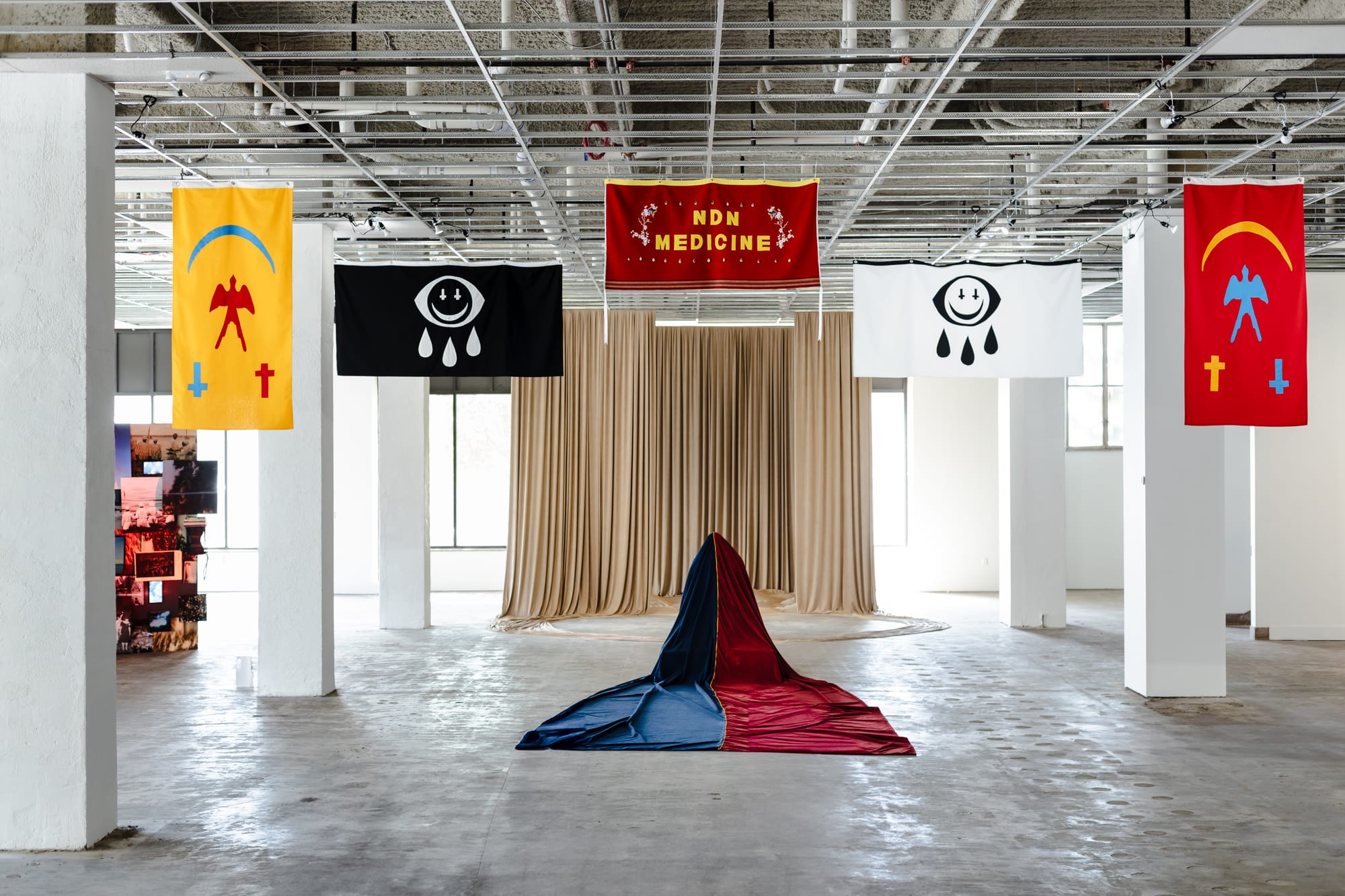 On a private viewing accompanied by Chaplin and Aveilhé, I found myself crying at Le’Andra LeSeur’s piece, “That body of (a reflection of the sky),” a freestanding, kaleidoscopic sculpture that uses collage, video, light, sound and original poetry to walk the viewer toward a baptism, or perhaps an anti-baptism. Accompanied by an audio excerpt from a sermon, the clanging of church bells from another piece in the show and those of the nearby Cathedral District, the piece evokes complicated feelings of collapse, renewal, ancestral wisdom and spiritual trauma found in healing waters. Especially when viewed against the symbolism of river as a road, Chaplin pointed out, which guided the forced migration of Native and Indigenous ancestors to Oklahoma, these ideas and emotions become even more pronounced.