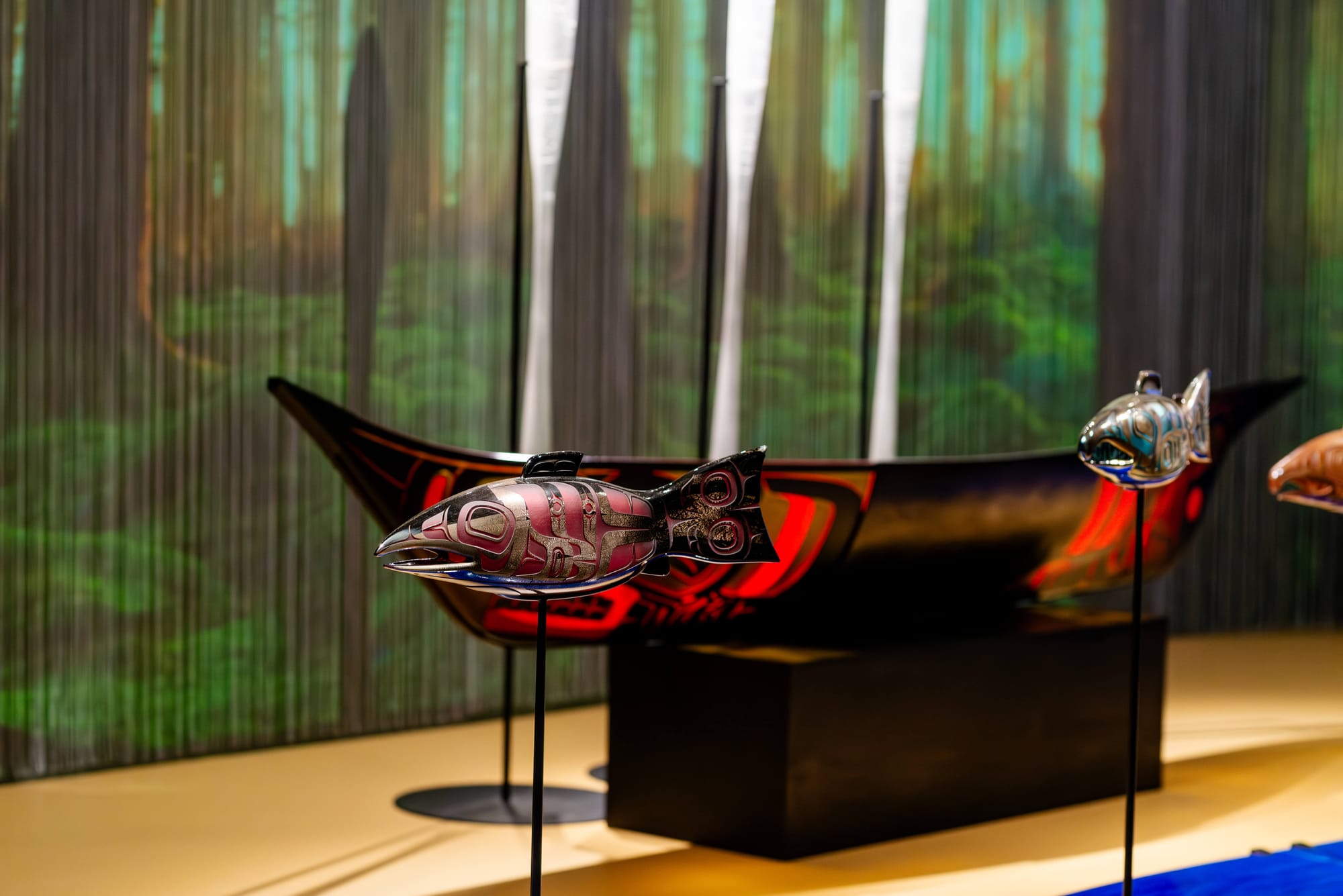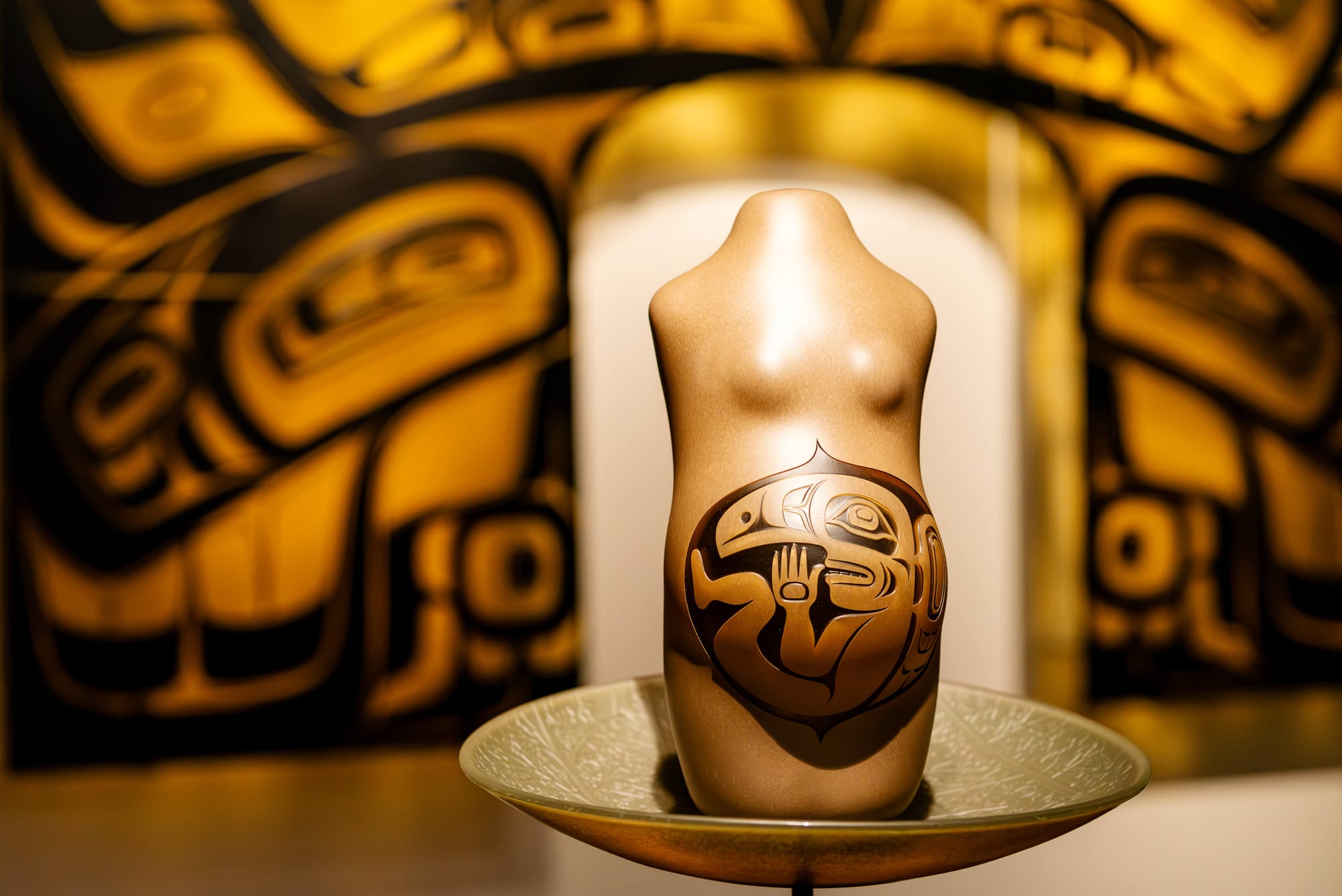 “Walter shared with me lots of the information and details about the story. And so I tried to evoke those elements or those feelings within the story in this exhibition,” Singletary says. “So many years of developing my skills as a designer in the Northwest Coast style. And it took about three years to put this exhibition together. So I would make a few pieces and then I’d put them in storage. And then over a three-year period, I finally had all the elements for the story.”