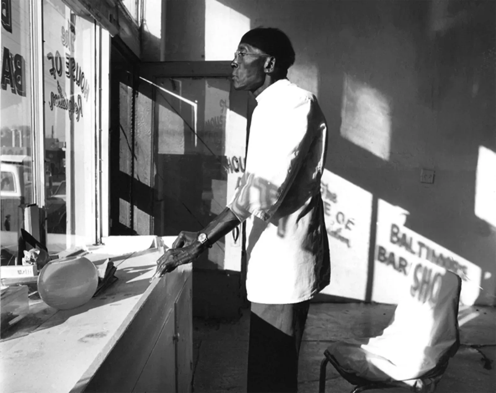 LEFT: “Baltimore Barbershop,” Tulsa, OK, 1970 By Don Thompson. RIGHT: “Portrait of Michael Hulett” 2024, By Kit Young