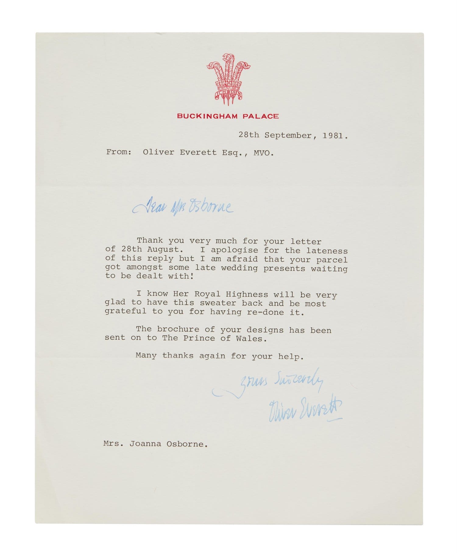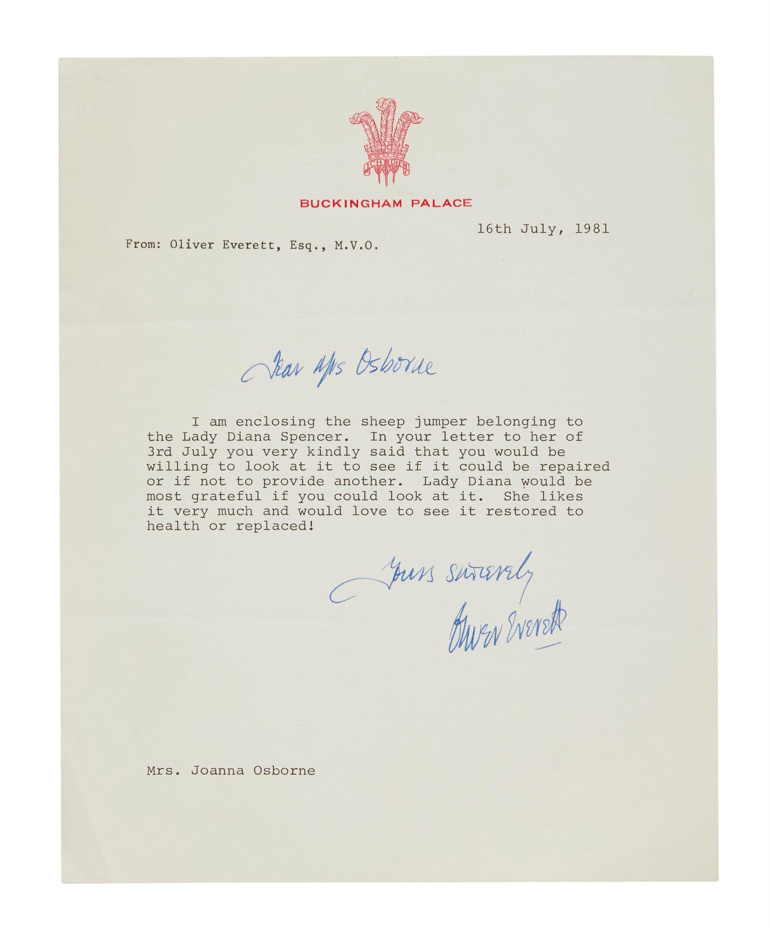 LEFT: Correspondence from Buckingham Palace to Joanna Osborne in reference to having a damaged sleeve repaired or replaced for the late Princess Diana.