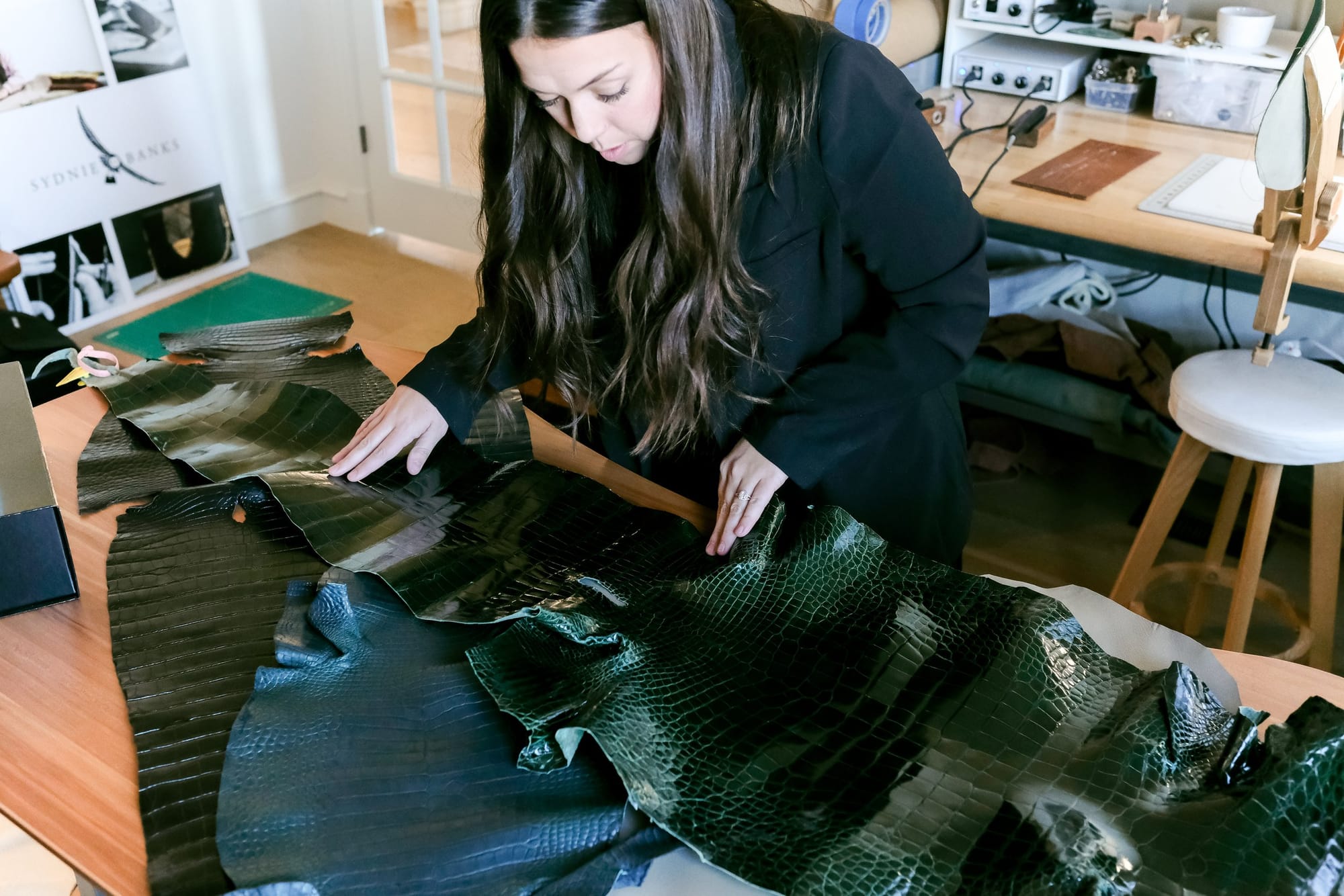Everything is neat and organized just so in the studio. One wall has rolls of creamy and colorful cow leather rolled tight and stored safely in shelves; across from it in separate shelving, piles of ethically sourced American alligator and snakeskins in a rainbow of vibrant colors.