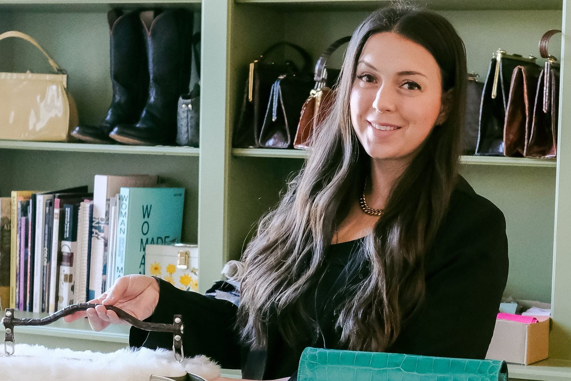 On the walls are shelves with vintage bags that inspire her — though Peebles’ bags are not on display, but safely tucked in their boxes. A prized purse from her grandmother’s collection is framed on the wall. Additionally, pairs of beautiful leather cowboy boots stand on the shelves.