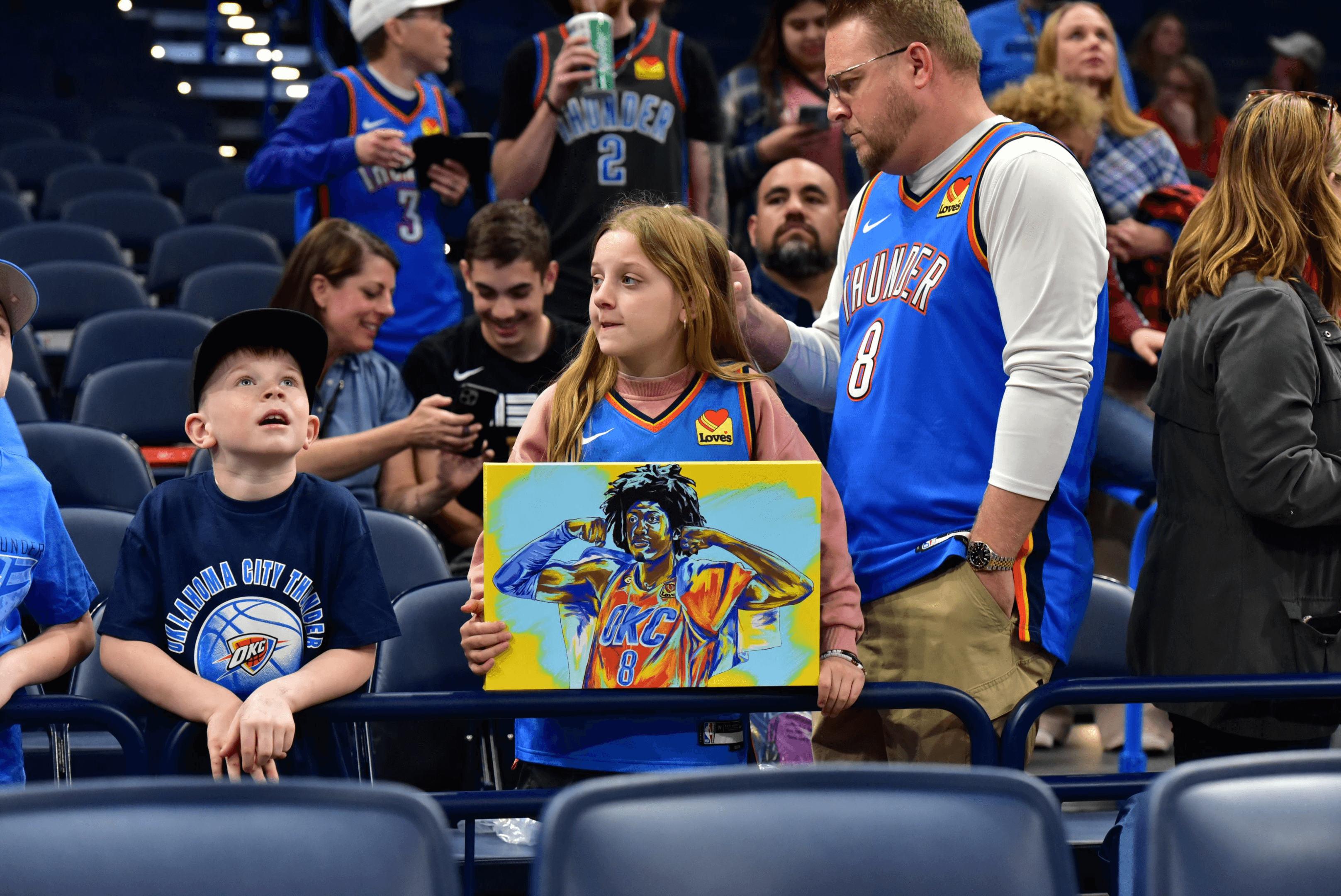 Sadie Ryder didn’t have to come as far as Yang: The 10-year-old from Yukon has been coming to Thunder games since she was 4 years old and said the first autograph she ever received was Russell Westbrook’s. But now, with this new crop of players, Ryder and her family have stepped up their game. They have started bringing digital paintings of the players and having them signed. When she got Jalen Williams to sign the artwork of himself, it was the fourth autographed painting that she’s been able to collect.