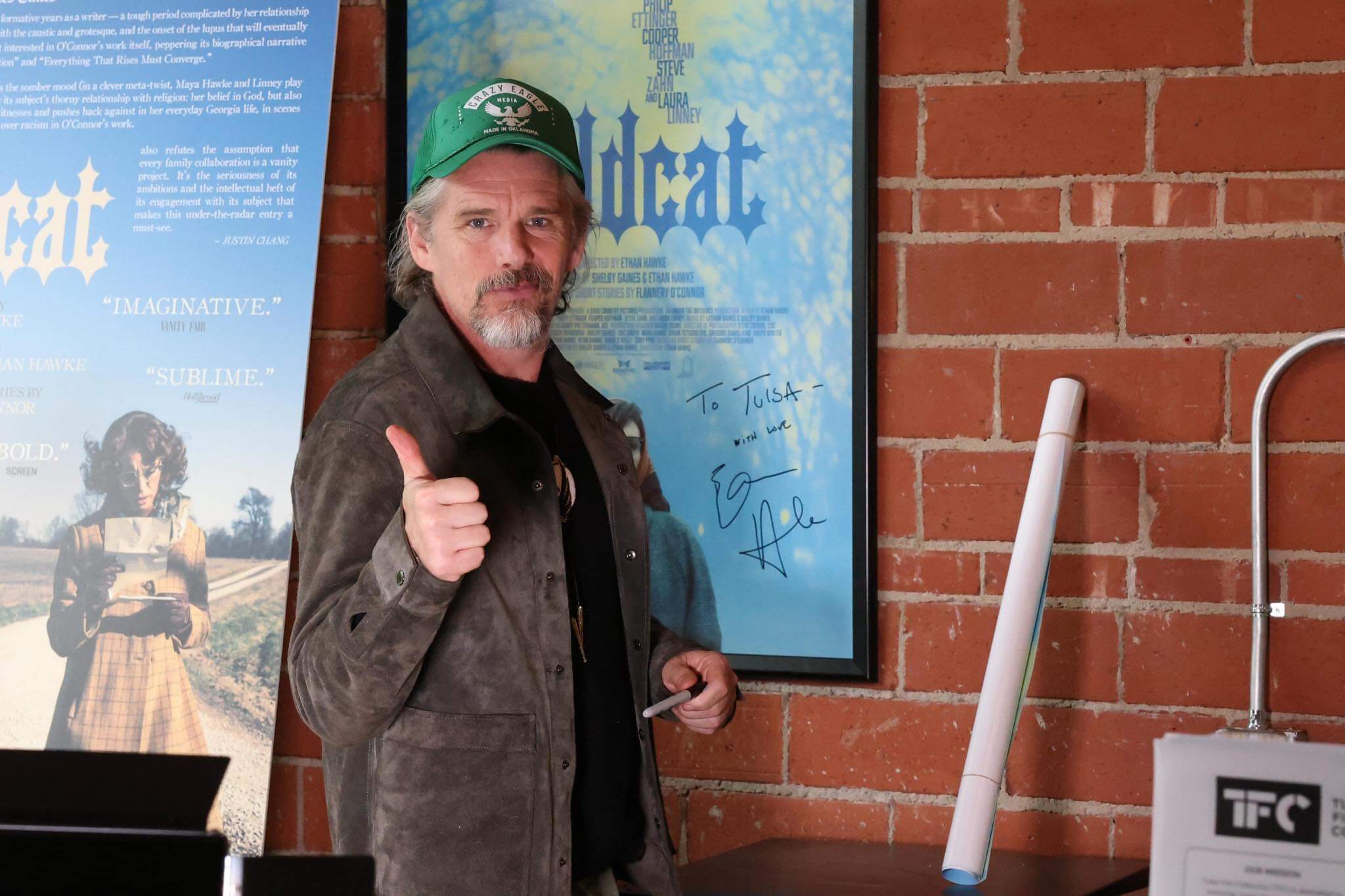 LEFT: Shagah Zakerion, Jessica McEver, Ethan Hawke, Charles Elmore and Sterlin Harjo at Circle Cinema for the pre-release screening of Hawke's new film Wildcat by Flannery O'Connor. (Photo by Brittany Bendabout) / RIGHT: Ethan Hawke gives Tulsa a thumbs-up at the pre-release screening of Wildcat at Tulsa's Circle Cinema. (Photo by Miranda Due)