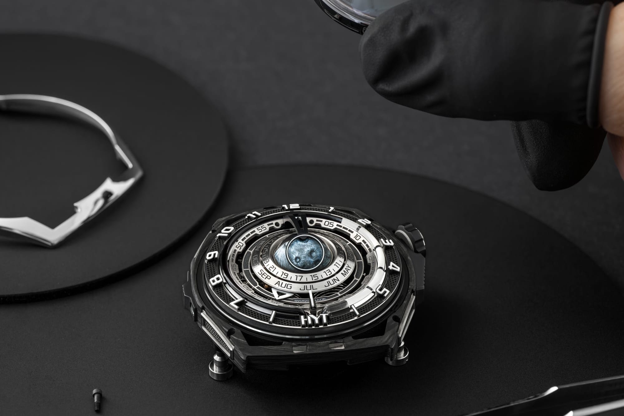 Naifeh, who by now is quite the horological expert, explained that with HYT it’s all about the cool factor, although it’s a precisely engineered feat of near-magic. “There are two parts to the movement, whereas most watches are strictly just an automatic or mechanical movement, or you can force movement. The HYT has a mechanical movement with the main screen, but then at the base, it has a liquid module, and the liquid module is two-part. There are two baffles, which regulate the flow of the liquid, and they also regulate the expansion or contraction based on temperature,” she says. HYT, like Bovet, is 95% Swiss hand-crafted. The only thing made outside of Switzerland is the strap.