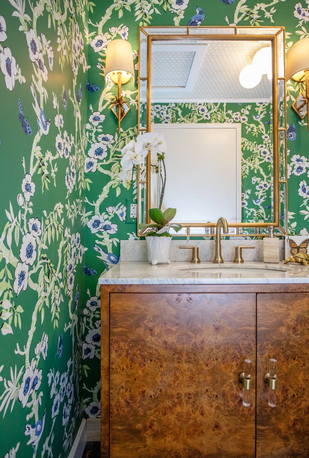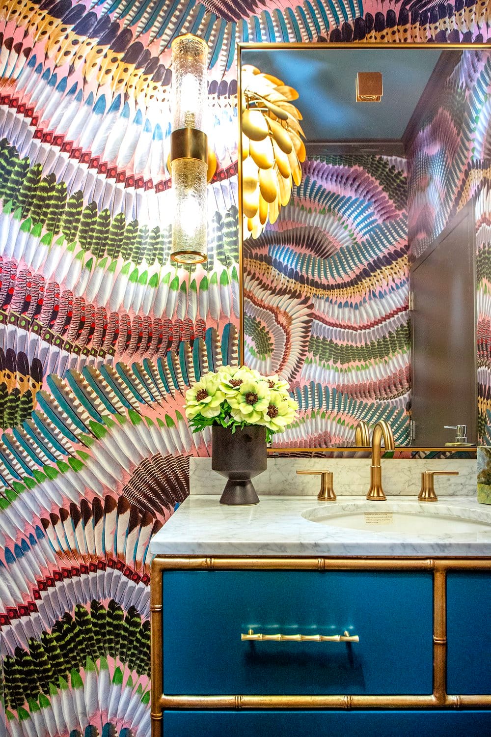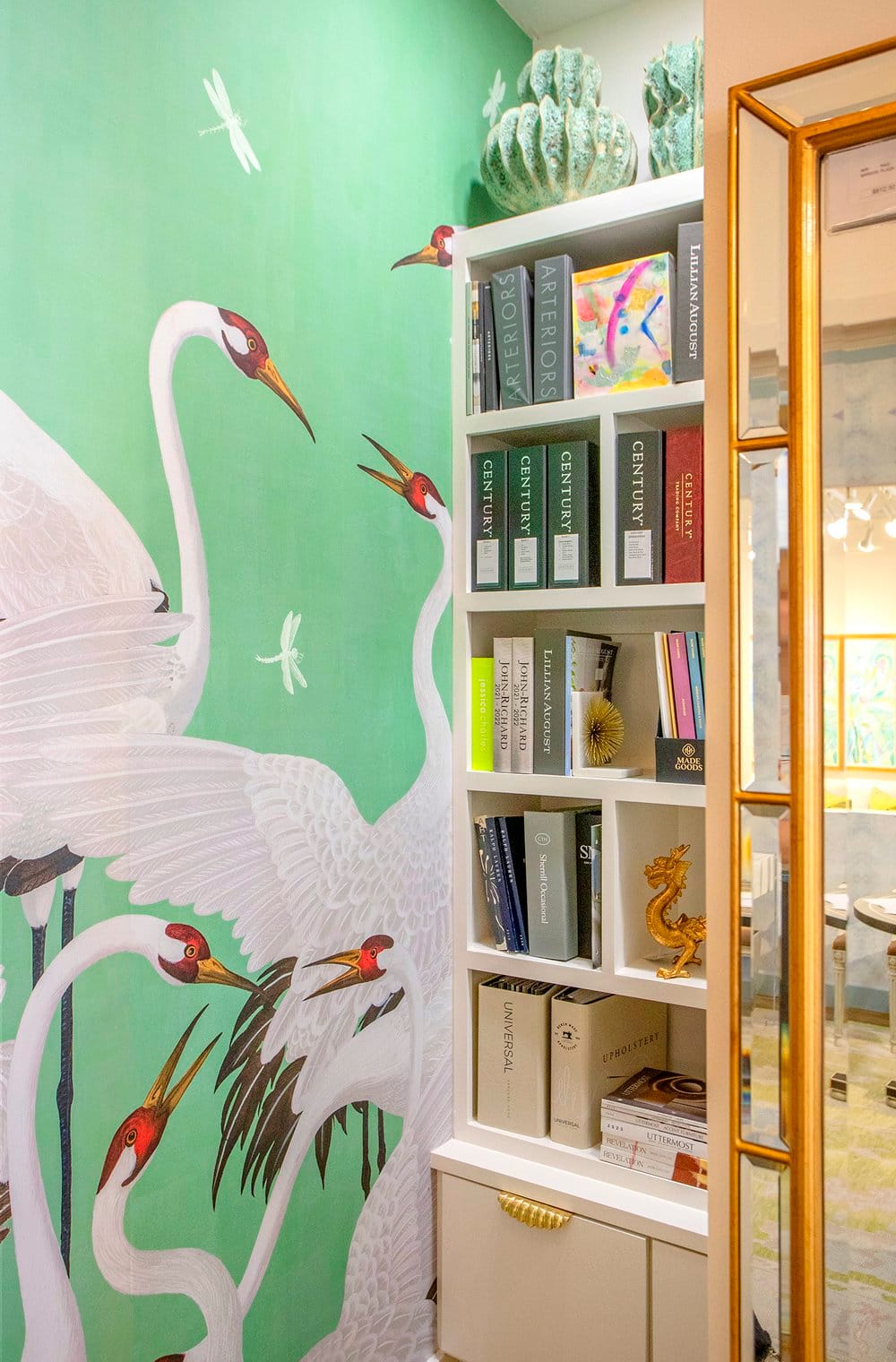 “Creating a tactile experience using our favorite textiles, lighting and signature design style throughout was very important to us when cultivating this new space. We want our customers to be able to see the function as well as the beauty when they walk into our showroom and design center,” says Henry. From the pop of Gucci wallpaper in one of the resource nooks to the impeccable bubble-like sconces in Henry’s office, it’s a lot of beauty to behold and an outstanding source for ideas.