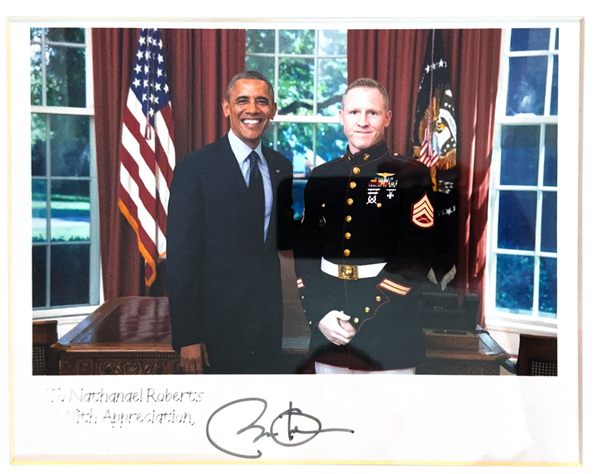 LEFT: Signed photograph of President Barack Obama with former Marine staff sergeant Nate Roberts